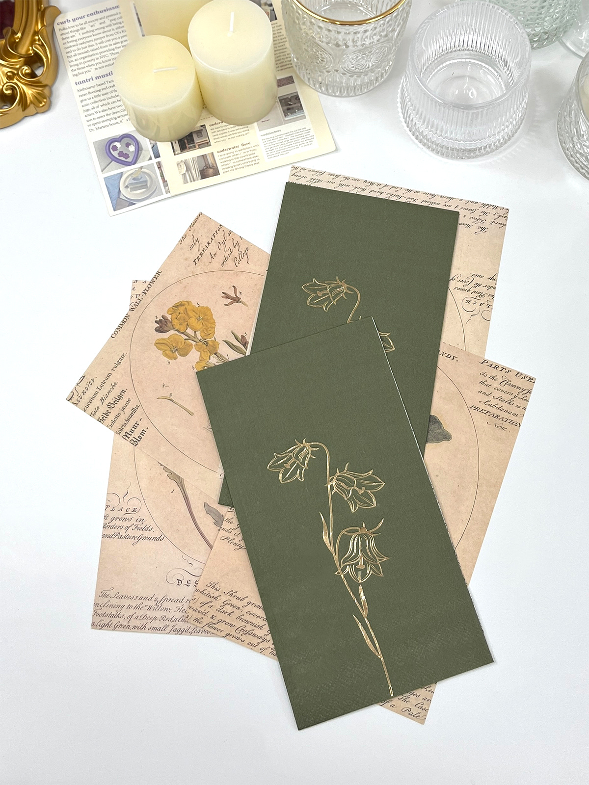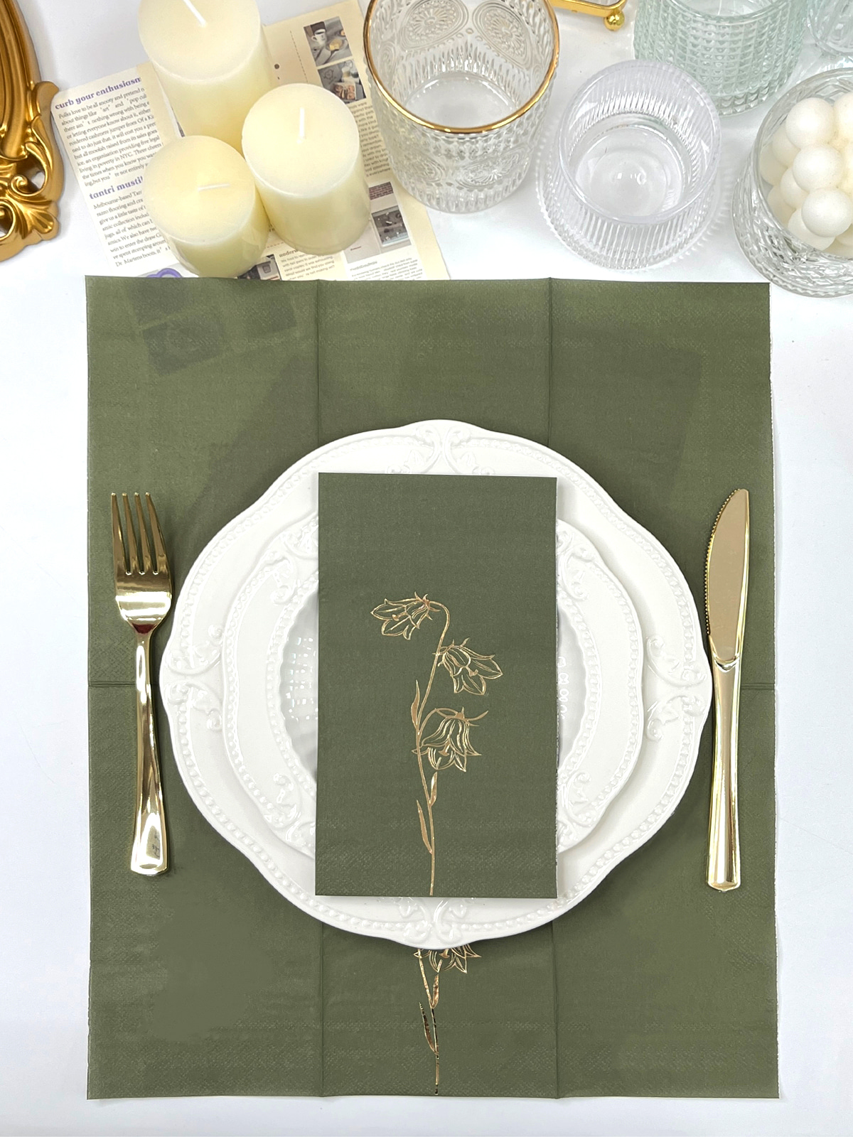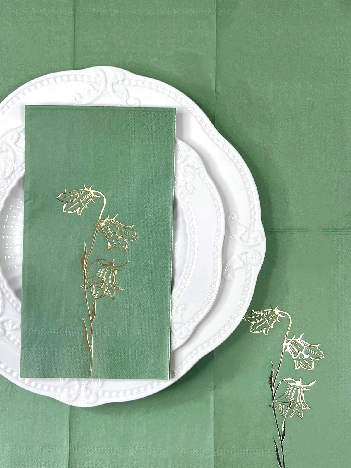 Kultainen kielo laakson vieraslautasliinoissa on monimutkaisia kukkakuvioita vihreällä ja tummanvihreällä taustalla. Ne ovat houkuttelevia ja tyylikkäitä juhlakoristeita, jotka sopivat häihin, illallisiin, kylpyhuoneisiin ja muihin.