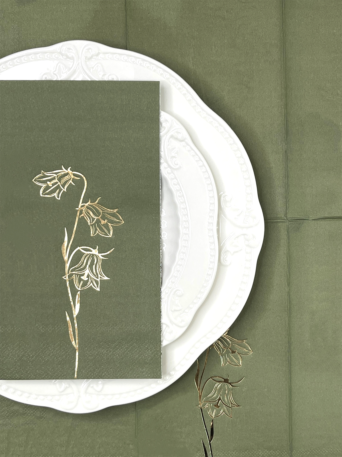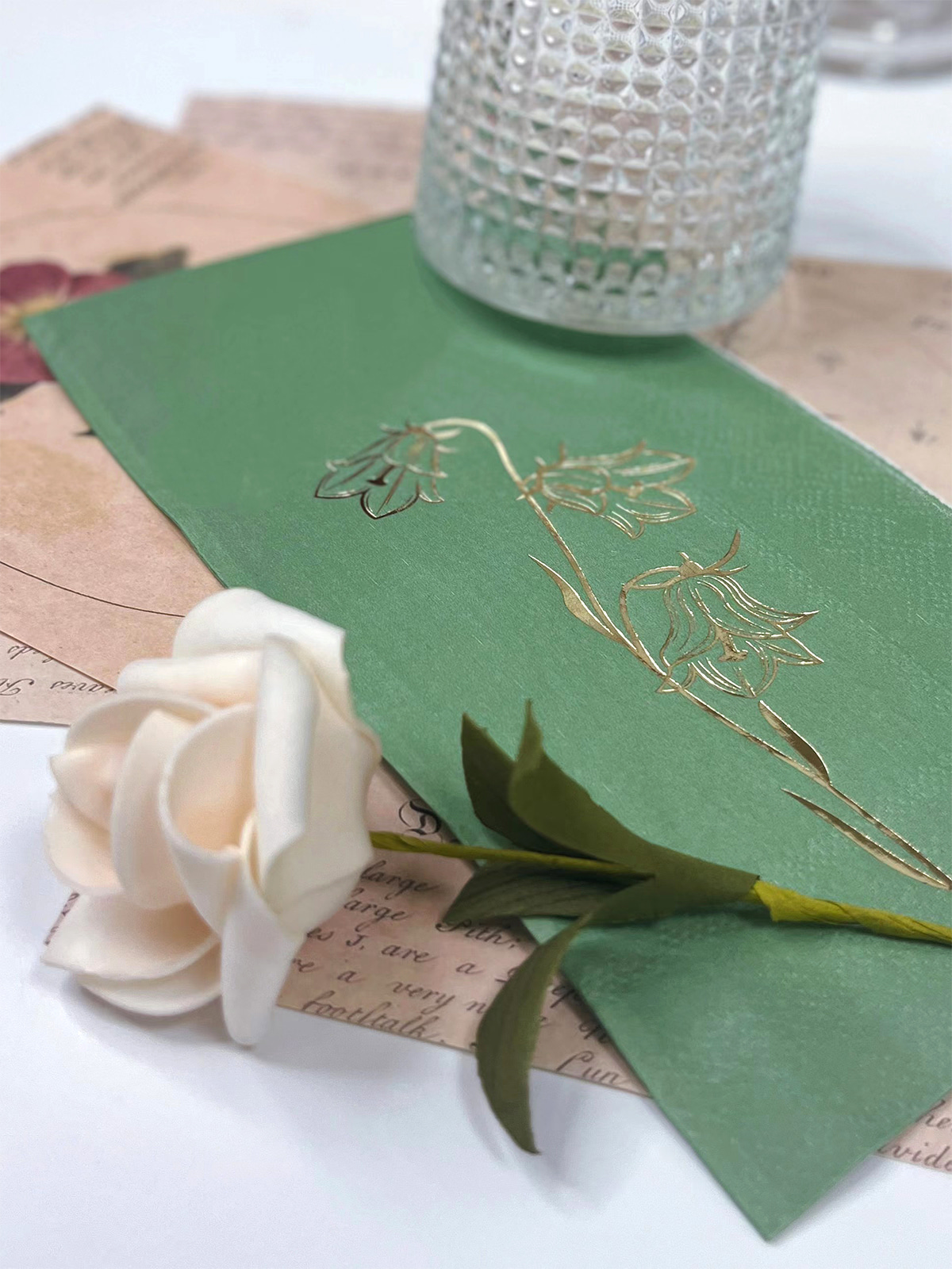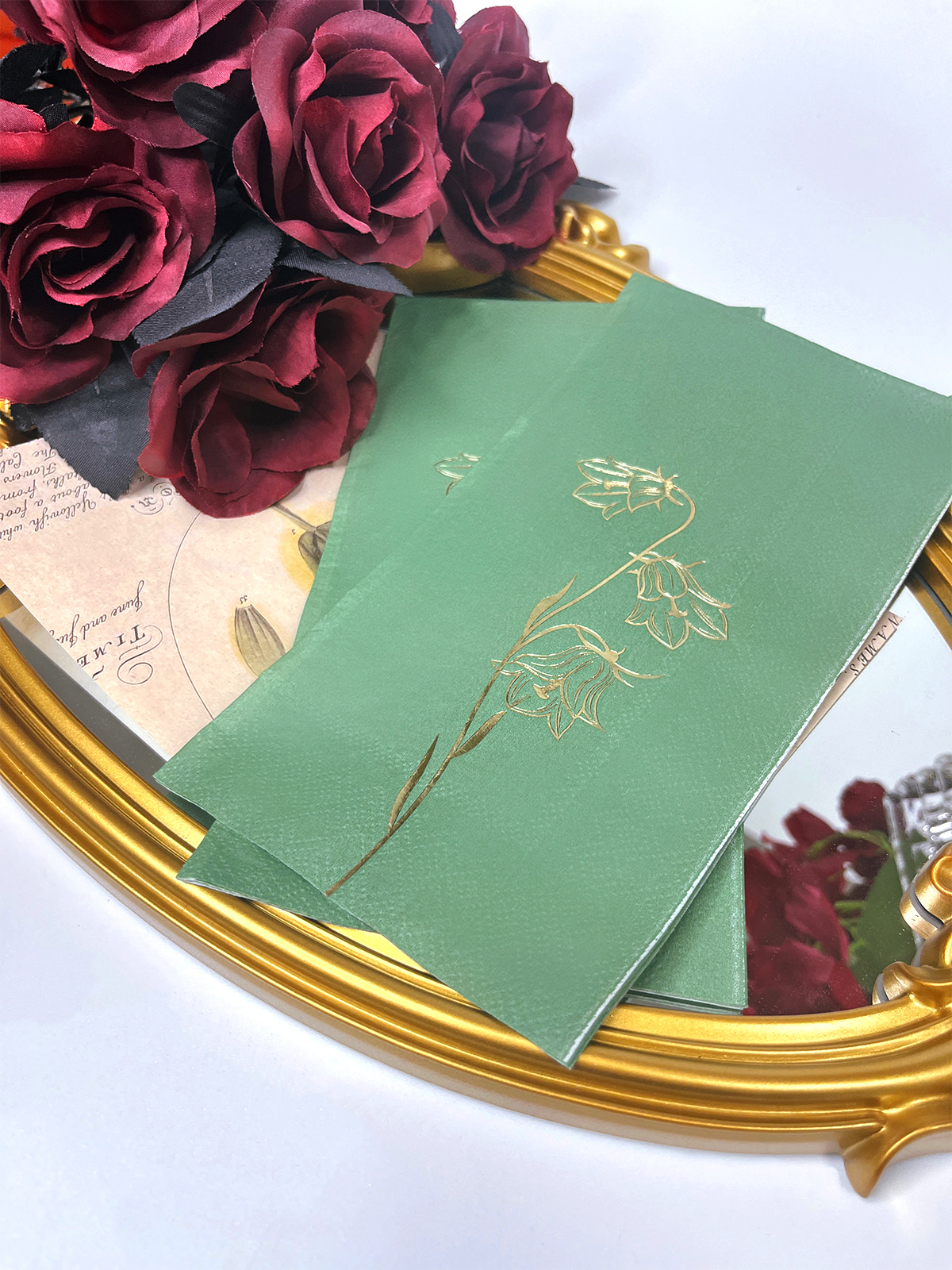 Kultainen kielo laakson vieraslautasliinoissa on monimutkaisia kukkakuvioita vihreällä ja tummanvihreällä taustalla. Ne ovat houkuttelevia ja tyylikkäitä juhlakoristeita, jotka sopivat häihin, illallisiin, kylpyhuoneisiin ja muihin.