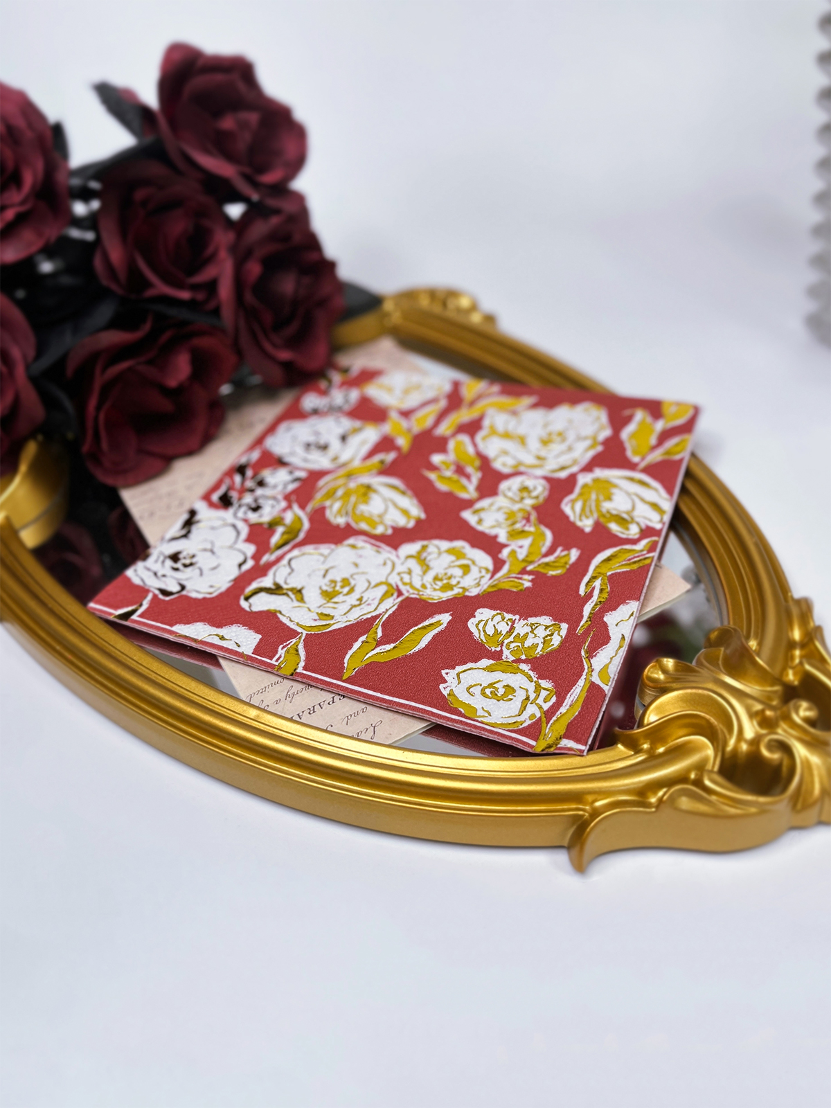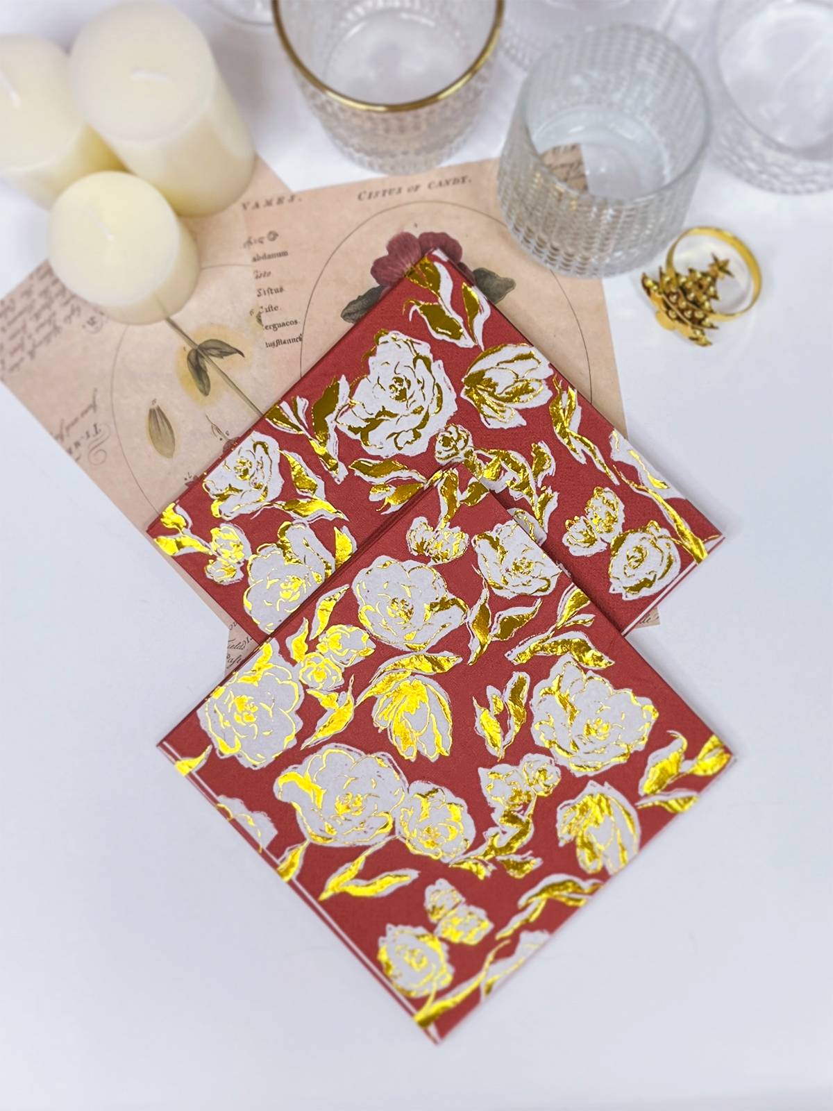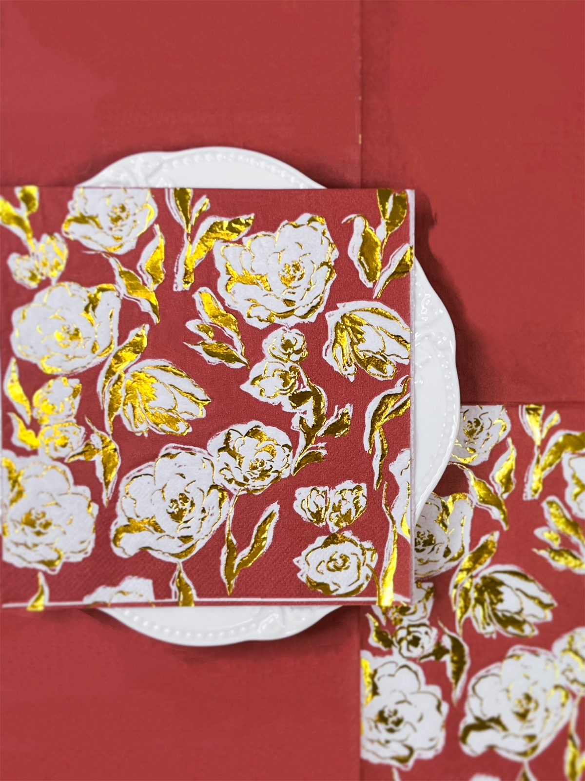 Lounaslautasliinat on suunniteltu hienovaraisesti kultaisilla foliokukilla punaisella taustalla, mikä lisää ripauksen eleganssia tapahtumiisi. Ne ovat silmiinpistäviä ja visuaalisesti houkuttelevia.