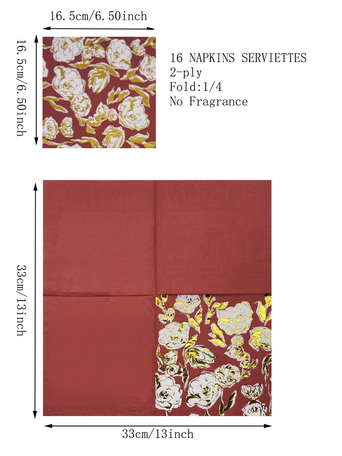 Tämän kullanvärisen kukkapaperilautasliinan koko on 13 x 13 tuumaa avattuna ja 6,5 x 6,5 tuumaa taitettuna.
